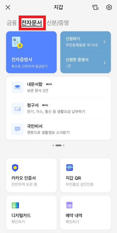[카카오톡 지갑] - [전자문서] - [신청한 증명서]에서도 언제든 열람 가능합니다.