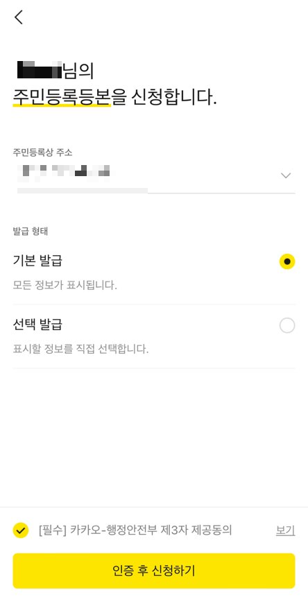 모든 정보가 표시되는 기본 발급과 표시할 정보를 직접 선택하는 선택 발급 중에 고르신 뒤, 본인 인증을 하면 됩니다.