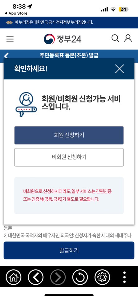 화면 하단의 발급하기 버튼을 누르면, 회원/비회원을 선택하는 창이 뜹니다.