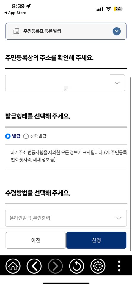 주소와 발급형태, 수령방법을 선택하신 후, 신청을 누르면 됩니다.
