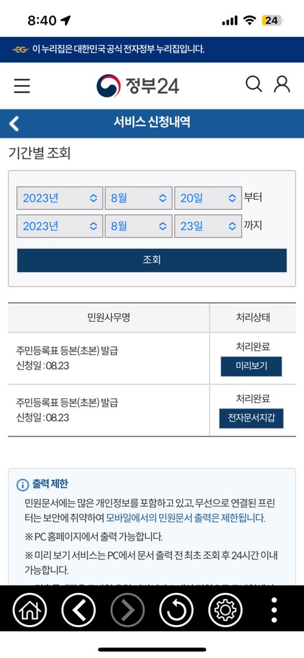 참고로, 보안상의 이유로 모바일에서는 출력이 불가능하며 PC로 들어가서 출력해야 합니다.