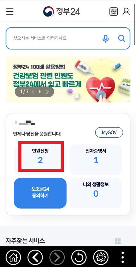 정부24 어플에 들어가면 메인 화면에 떠있어요.