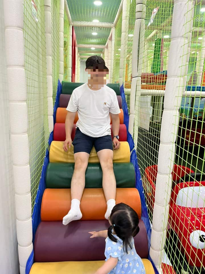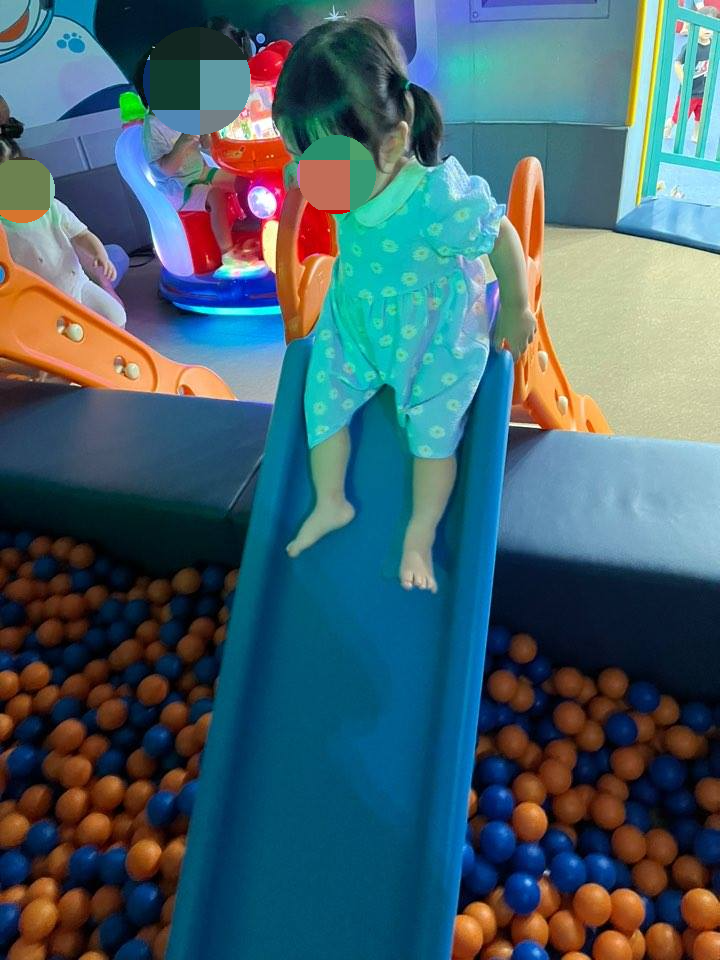 미끄럼틀을 타고 볼풀장에 빠지는 게