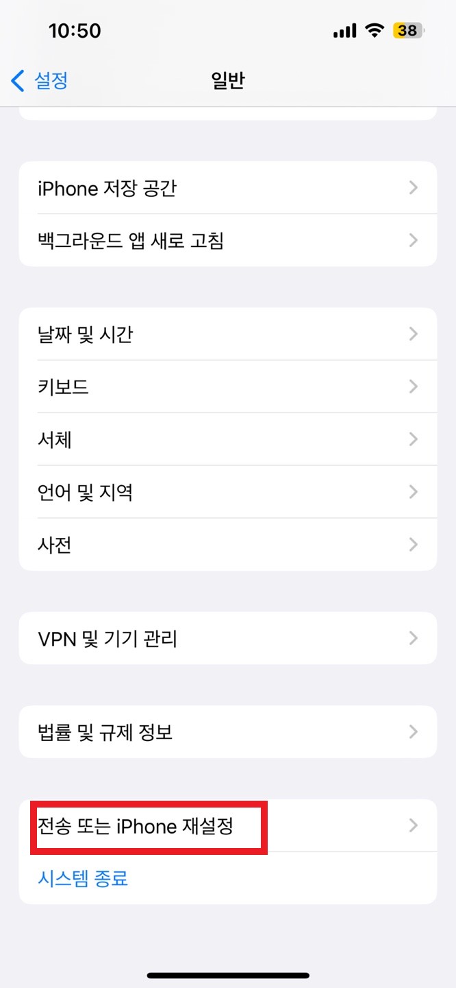 [설정] - [일반] - [전송 또는 iPhone 재설정] 버튼을 누릅니다.