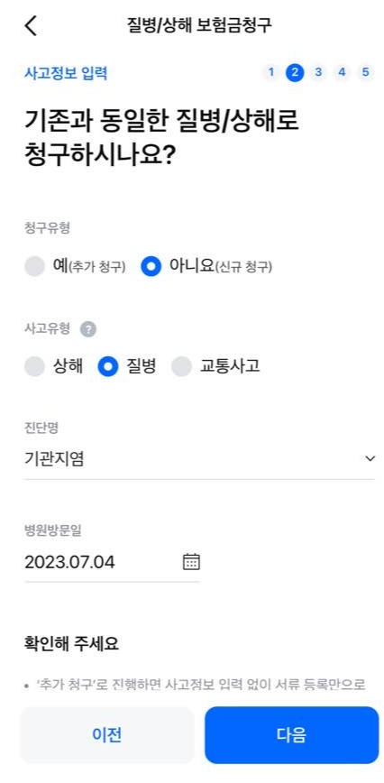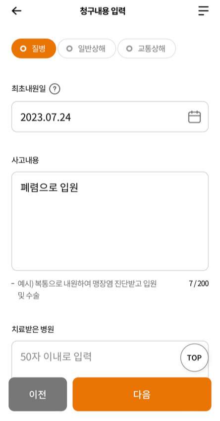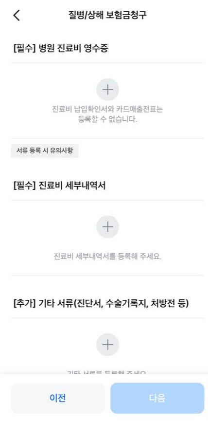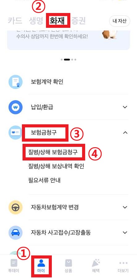 어플에 접속해 질병/상해 보험금청구를 누르세요.
