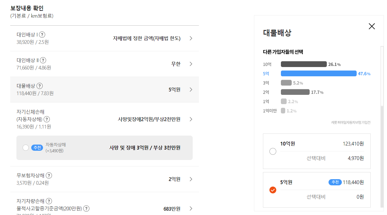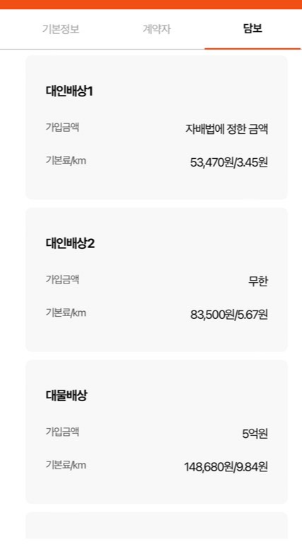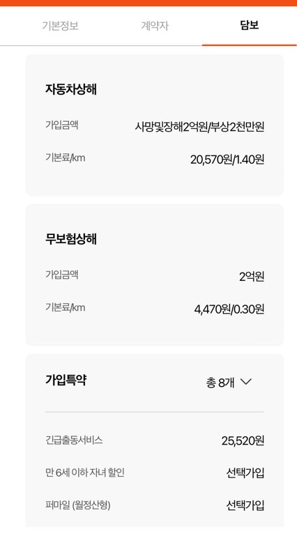 담보에 따라 킬로당 보험료가 달라집니다.