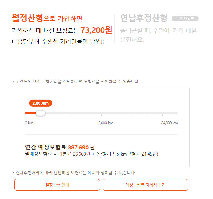 연간 주행 거리에 따른 예상 보험료가 나오고,