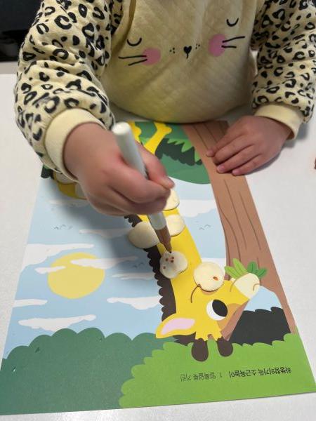 천사점토에 갈색 사인펜을 섞어 색을 내고 기린에 붙여주었는데 재밌어하더라고요.