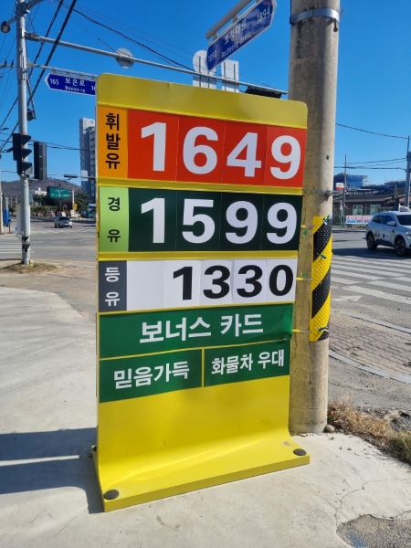 지난주, 대전에서는 1,500원에 샀는데 보은 산림조합주유소에서는 1,330원에 팔고 있었어요.